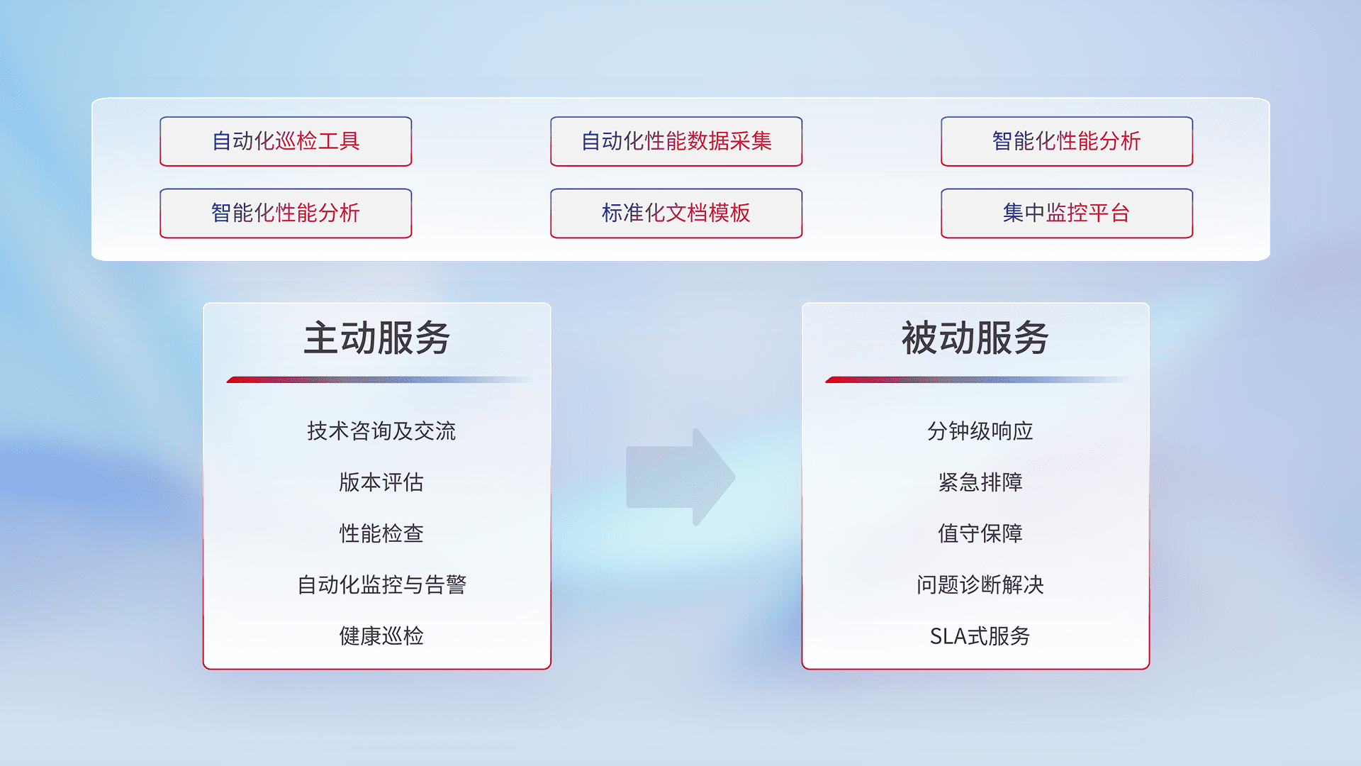 智能化工具和标准化文档,,保障服务质量,,,提供主动服务(包含技术咨询、、、、版本评估、、、性能检查、、、、自动化监控与告警、、、健康巡检)和被动服务包含(分钟级响应、、、、紧急排障、、、值守保障、、、、问题诊断解决、、、SLA服务)。。。。